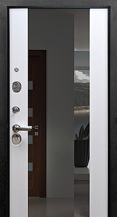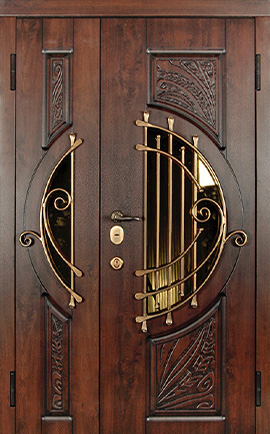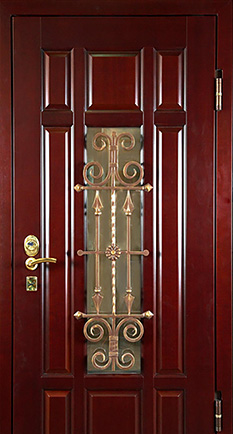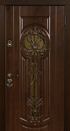 Кроме этого, есть модели с зеркалом, стеклом и ковкой. Например, если вам нужна презентабельная конструкция, обратите внимание на модель из массива дуба со стеклянной вставкой, отделкой коваными элементами, а с наружной стороны – зеркалом. В итоге у вас будет не только стильная и надежная стальная дверь, а и практичное решение для интерьера.